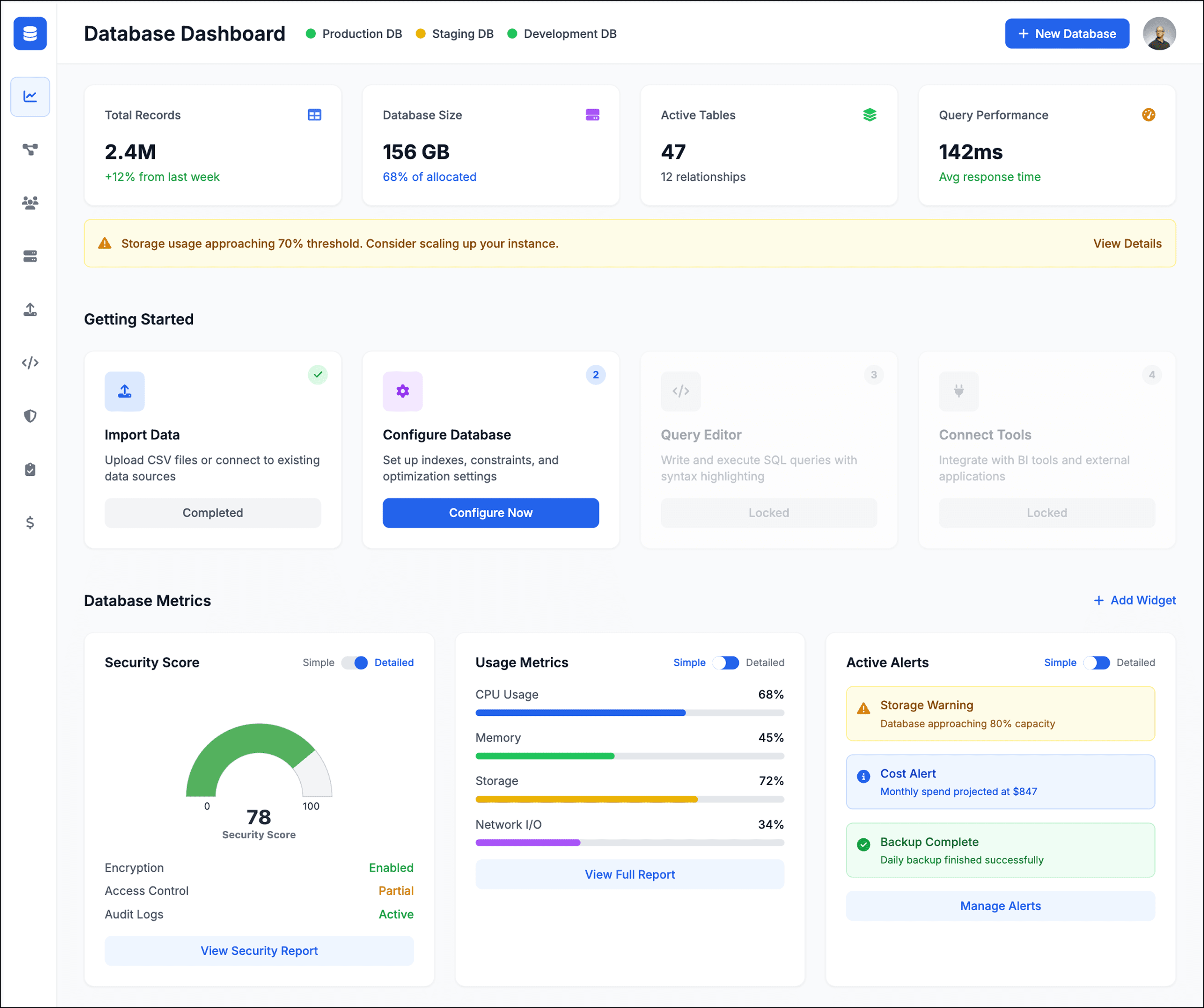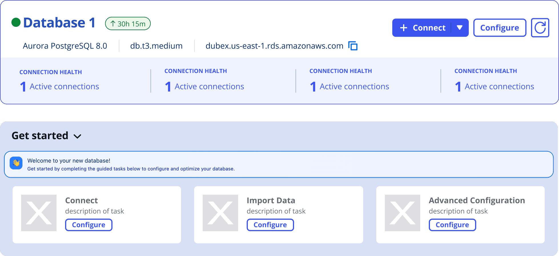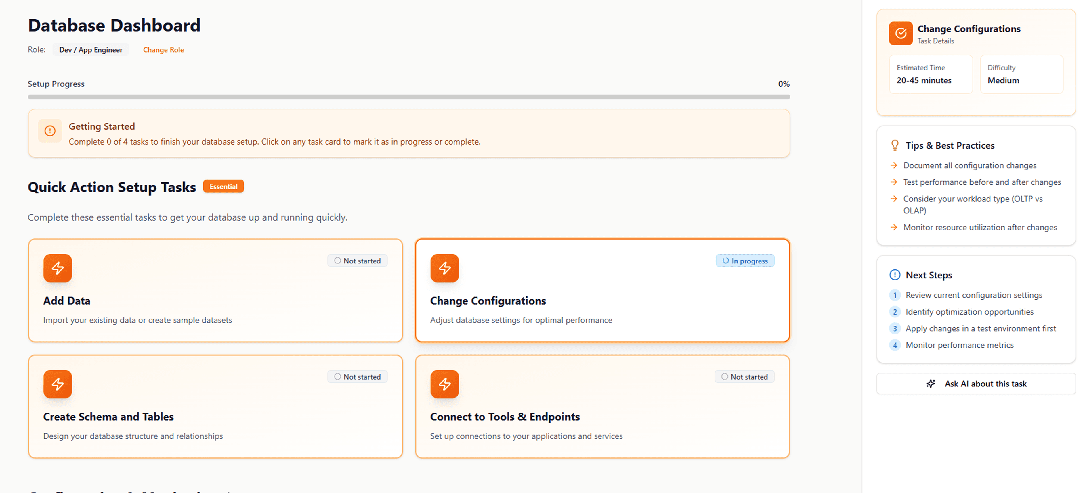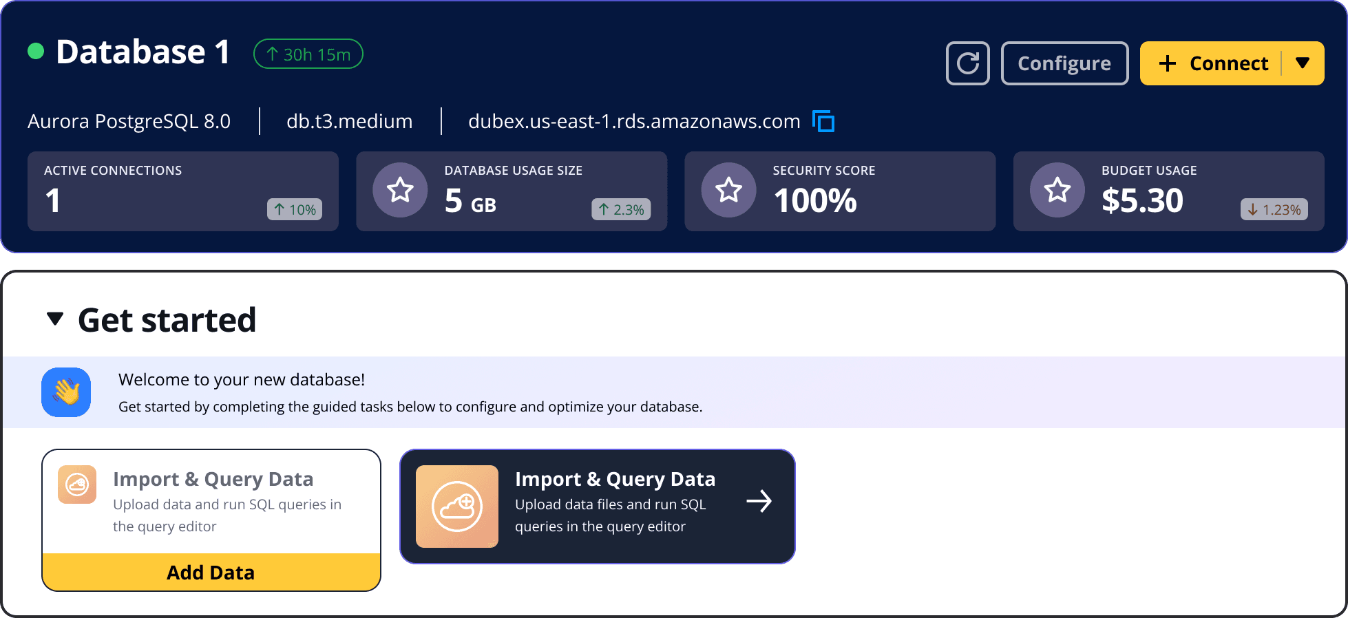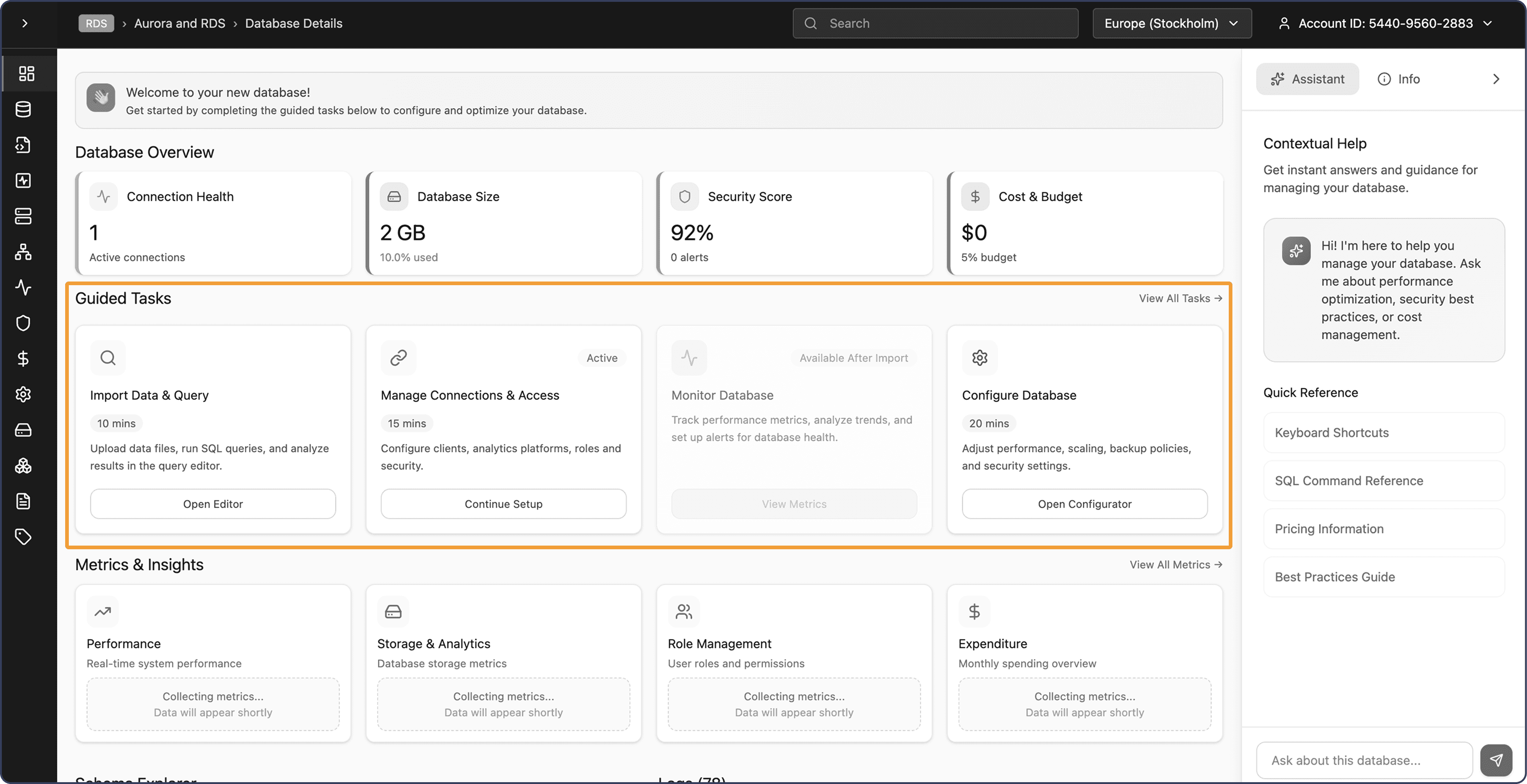 A card-based console & a guided tour reduced information blindness and surfaced clearer next steps after database creation.