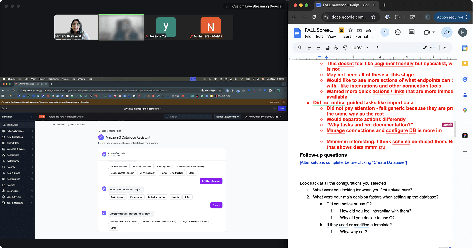 Our moderated usability setup: 1 interviewer, 1 note-taker, 1 moderator, rotate and repeat.